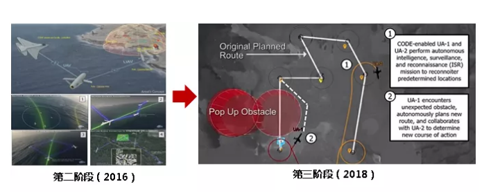 第三階段從2018年1月開始,測試使用6架真實無人機以及模擬飛機的協同能力,實現單人指揮無人機小組完成復雜任務。